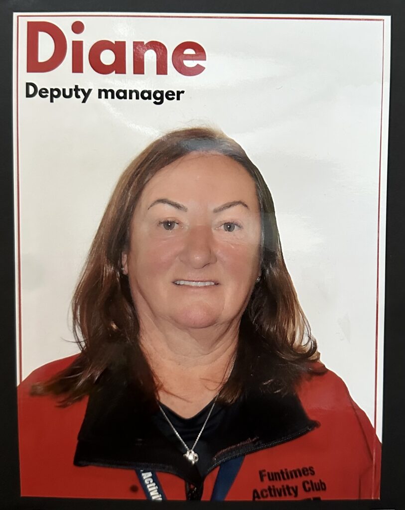Diane Coates Diane has been Deputy since 2017 she enjoys her role and has learnt so much in her time at Fun Times. Trained in Safeguarding, Diane is the Health and Safety and Fire Officer in the Club. Profile detailsLikes:0Comments:0Categories:Staff